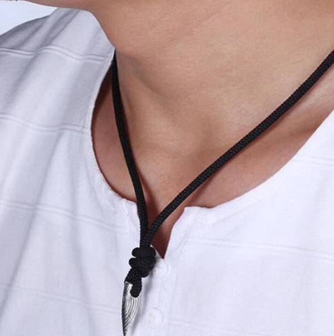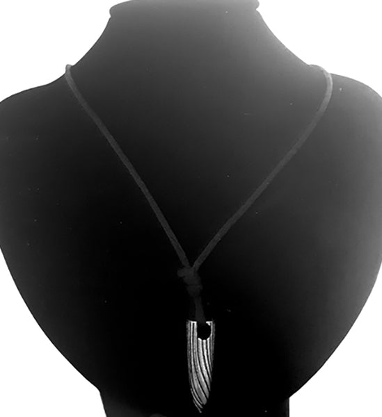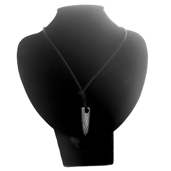 Halskæde med vedhæng i rustfrit stål, ca. 2,8 cm lang. Sort stofbånd. at være bundet i nakken.