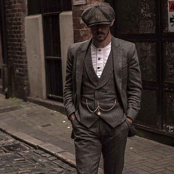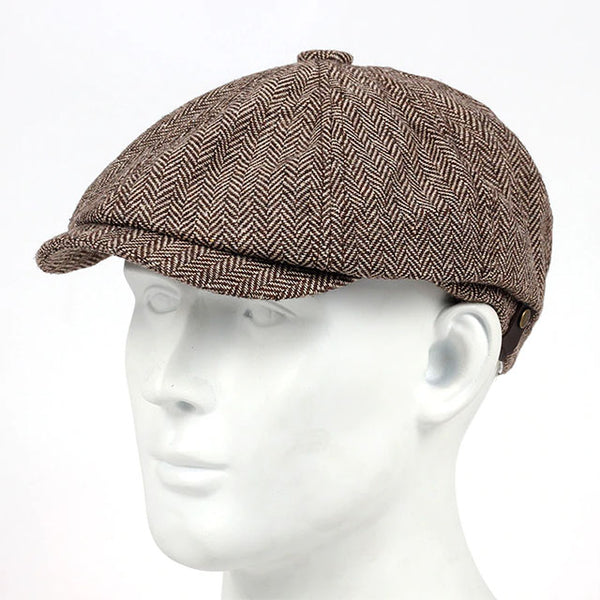 Newsboy cap in Brown / Beige herringbone patterned style. Elastic at the back so most people fit. pcs approx. 58. Button on the side. Fabric in Cotton Tweed