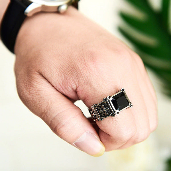 Ring metall med svart sten, utsmyckningar på sidan i form av medeltida kors.