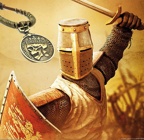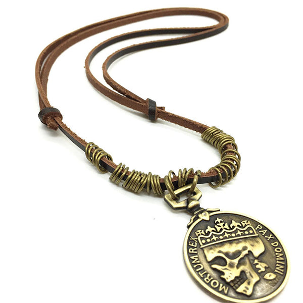 Halsband i brunt läder med metalldekorationer samt hänge i bronsfärgad zinklegering. Bild av dödskalle med kungakrona med inskriptionen MORTUM REX PAX DOMINI Vilket betyder En död kung av fred.
