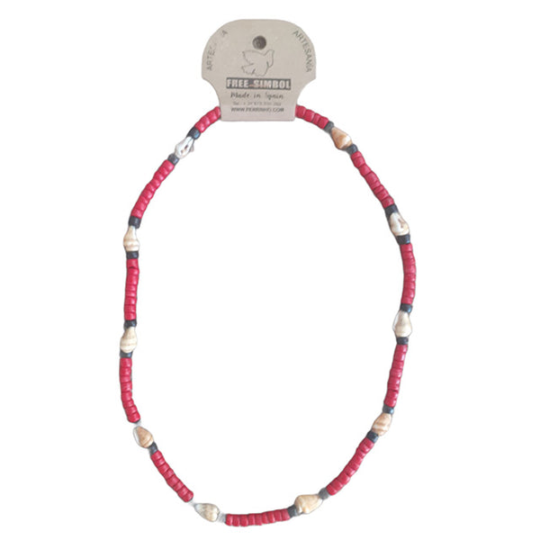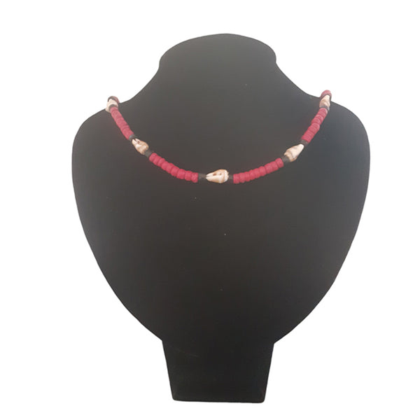 Klassiskt snäckhalsband sommarens obligatoriska halsband. Röda snäckor ca 5 mm med inslag av snäckor med andra färger och storlekar. Ca 44 cm långt, ska sitta nästan tajt runt halsen.