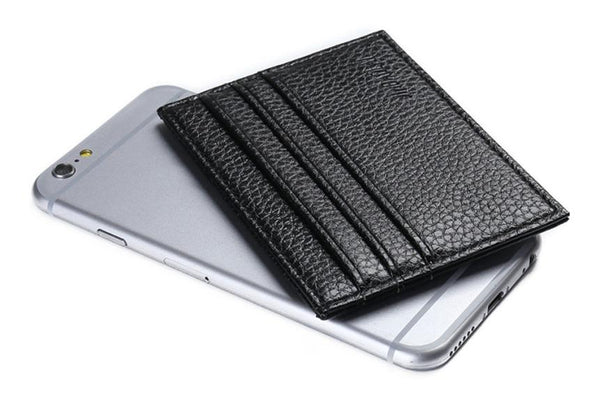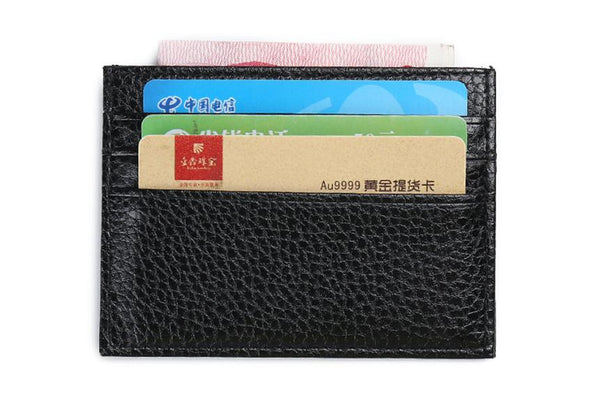 Black card holder in artificial leather. 11 x 9 cm, has three pockets on each side. Perfect for the restaurant or the beach. Let the big leather stay at home.