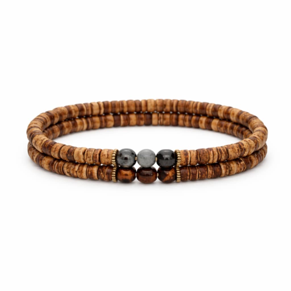 Snyggt dubbelarmband med sandfärgade pärlor samt vissa detaljer i avvikande kulörer.